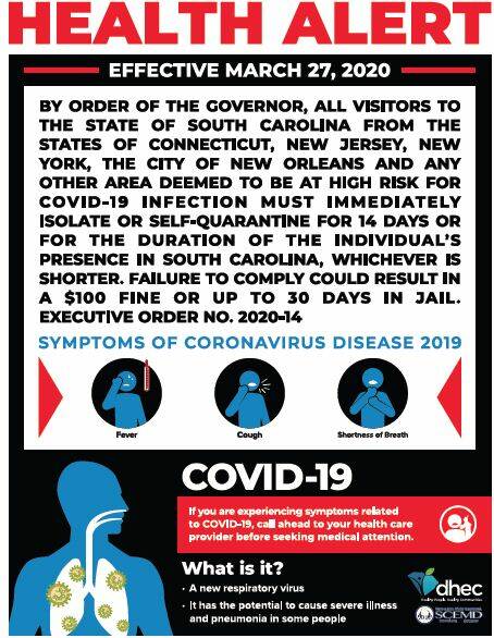The Governor’s Executive Order (No. 2020-14) that went into effect on March 27, 2020 says in part, ‘individuals who enter the State of South Carolina from an area with substantial community spread of COVID-19 shall be required to isolate or self-quarantine for a period of fourteen (14) days from the time of entry into the State of South Carolina or  the duration of the individual’s presence in South Carolina, whichever period is shorter…’